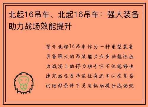 北起16吊车作为一种重型装备,具备强大的吊装能力和多功能性,成为战场上的得力助手。它不仅能够快速完成各类吊装任务,还可以在复杂的地形条件下灵活机动,提升战场效能。本文将从多个方面详细介绍北起16吊车的特点和作用,以及它在军事行动中的重要作用。