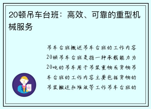 20顿吊车台班是指一种承载能力为20吨的吊车,用于吊装重物或货物。吊车台班的工作内容主要包括货物的吊装、搬运和堆放等工作。吊车台班的操作人员需要具备一定的机械操作技能和安全意识,以确保吊装作业的顺利进行。